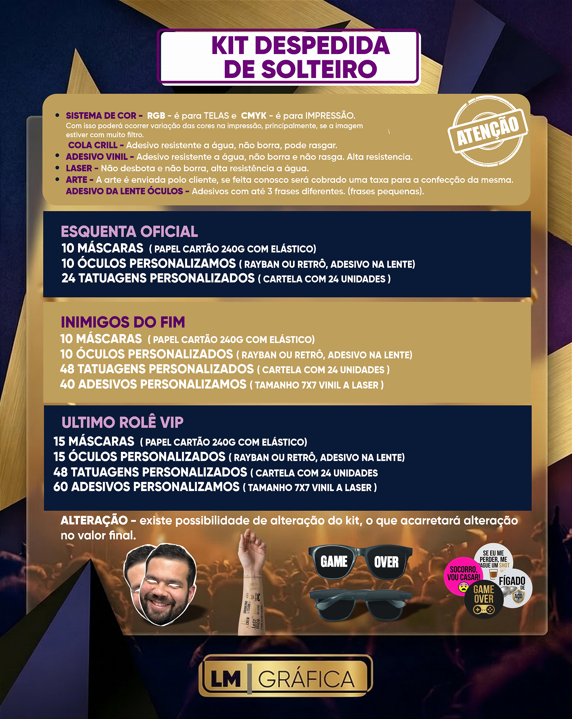 O kit que não pode faltar na mala do seu esquadrão chegou na LM | GRÁFICA. 🎭 Máscaras para a diversão 😎 Óculos para o estilo ⚡ Tatuagens temporárias 🏷️ Adesivos para os brindes